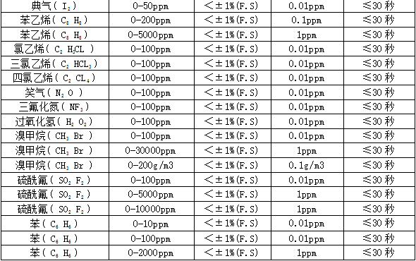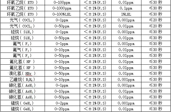 檢測范圍:0~1、10、100、1000、5000、50000、100000ppm、200毫克/升、100%LEL、20%、50%、99.999%、100%Vol可選,其他量程可訂制。