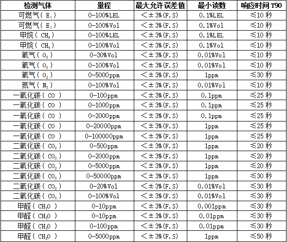 檢測范圍:0~1、10、100、1000、5000、50000、100000ppm、200毫克/升、100%LEL、20%、50%、99.999%、100%Vol可選,其他量程可訂制。